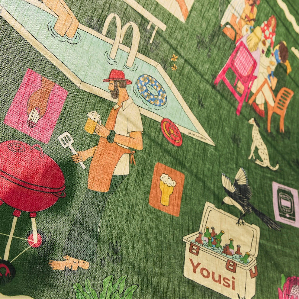 For her Yousi design, Ju has translated long lazy lunches, nostalgic summers and warm weekends into hand-drawn moments: a flicker from the BBQ, a tilted hat, the shape of laughter. Her work captures the kind of slow, joy-filled moments we all want more of... the ones we return to again and again.